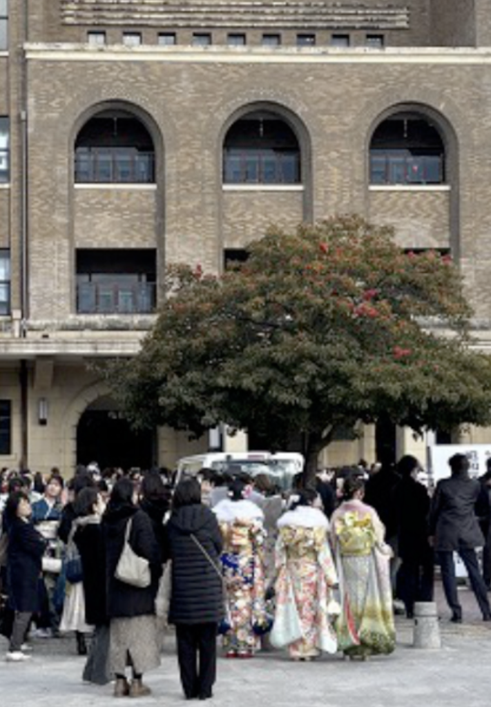 1⽉11⽇、公会堂前には成⼈式の開会を待つ20歳の若者たち に、おめでとうメッセージ⼊りのポケットティッシュを渡しながら抱負を聴かせてもらいました。