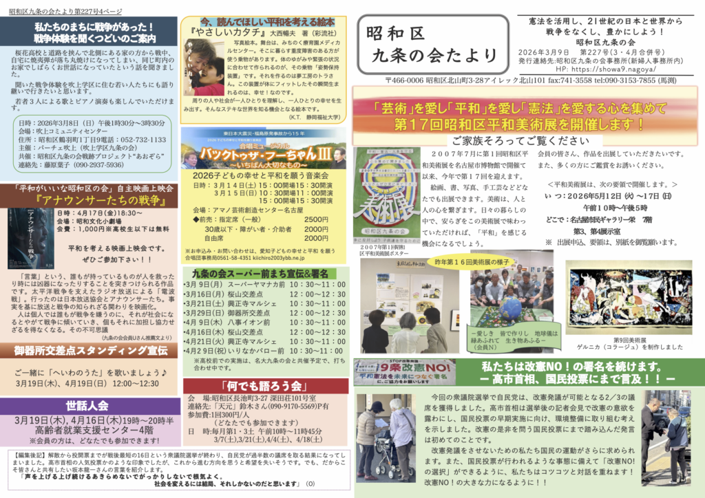 - 共催:昭和区九条の会戦跡プロジェクト“あおぞら” 連絡先:藤原葉子(090-2937-5936)