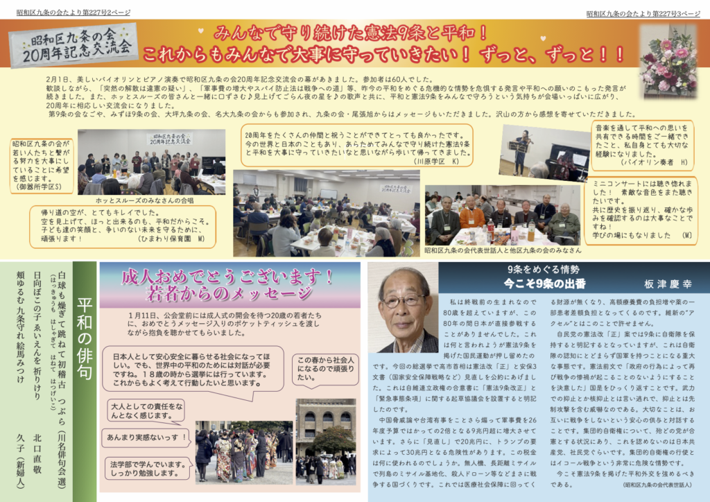 - 昭和区九条の会が若い人たちと繋がる努力を大事にしていることに希望 を感じます。 (御器所学区S)