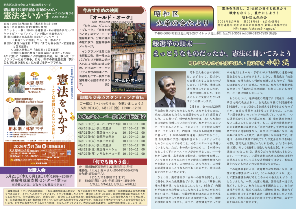 2月1日、会の結成20周年記念の集いがもたれましたが、あたかもその日は、政治に狂乱をもたらした総選挙のちょうど1週間前でした。この集いで、昭和区九条の会は、あいち九条の会に祝辞を依頼していたのですが、私がそちらのメンバーでもあることから、そのメッセージを伝える形でスピーチをしました。内容は、何よりも総選挙を念頭に置いて、Ⅰ.今回の解散は違憲・無効であること、Ⅱ.自民圧勝の予想は選挙制度のトリックによってもたらされたものであること、の2つのテーマを準備していました。ただ、私の長口舌のために、Ⅰが終わったところでドクターストップがかかりました。――それから2か月、高市政権は案の定、強権の度を増し、アメリカとイスラエルのイラン侵攻では戦争加担への歩を進めています。この時点で、あらためて、この度の総選挙はまっとうなものであったのかを、憲法に尋ねておきたいと思います。